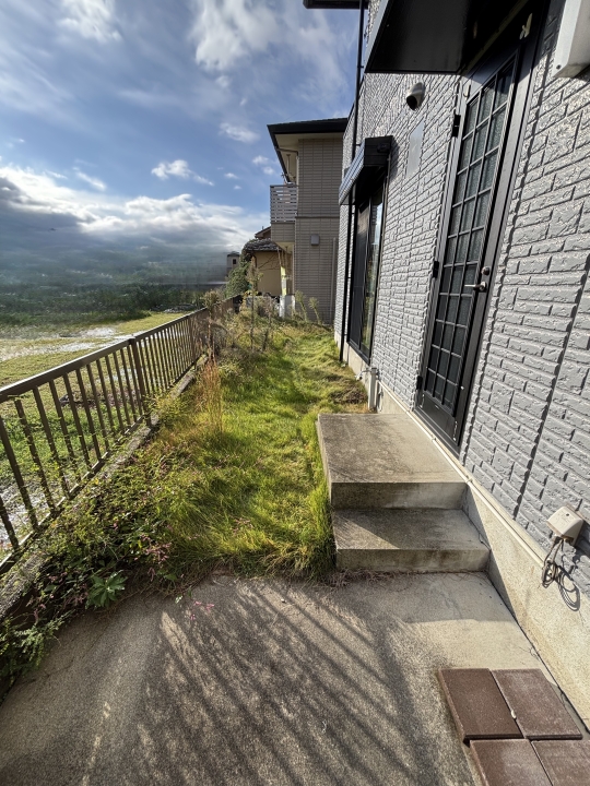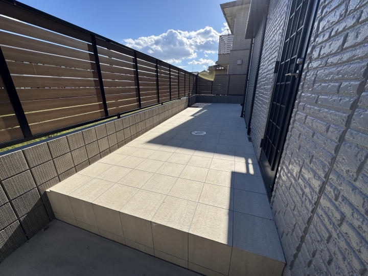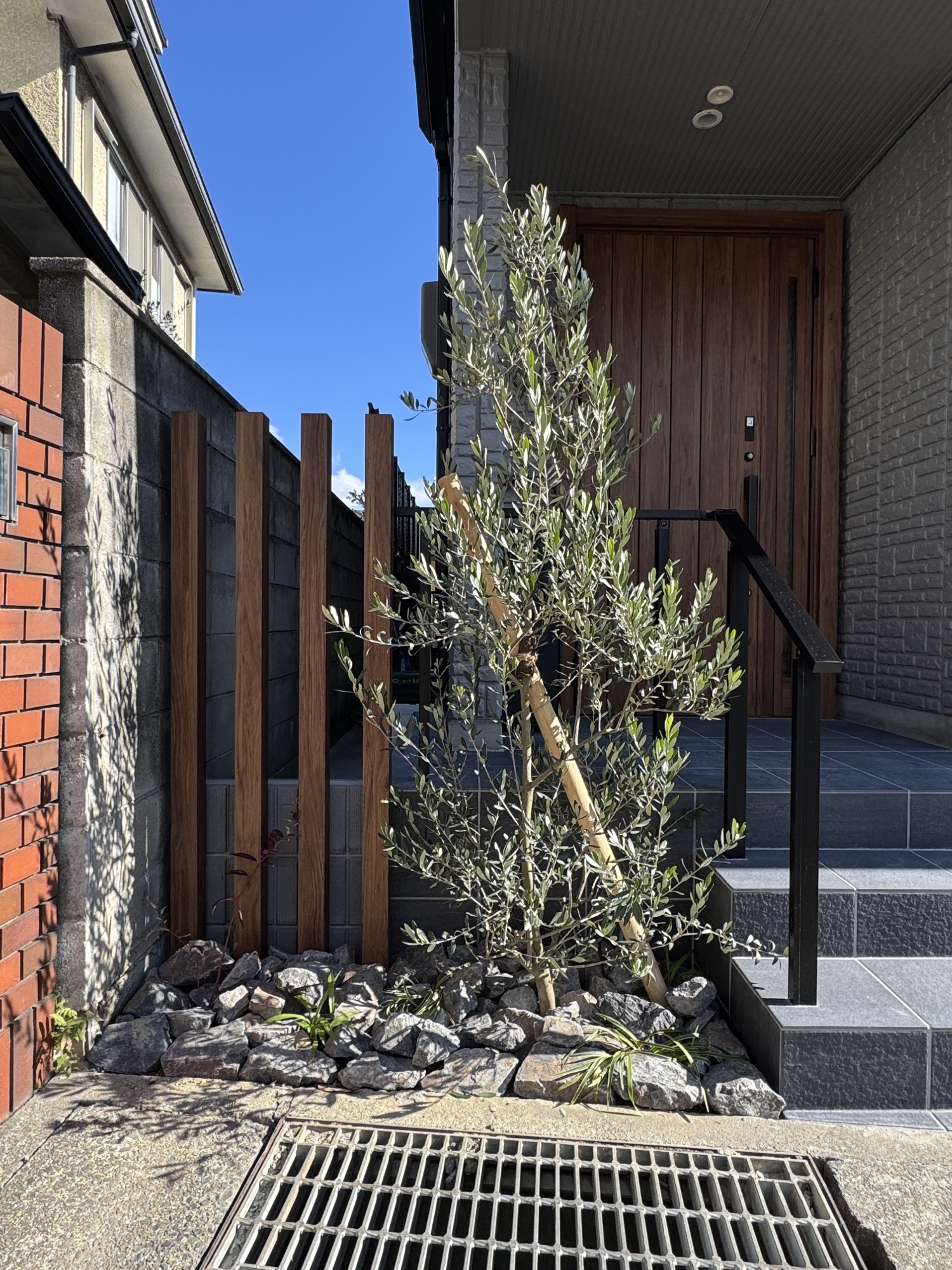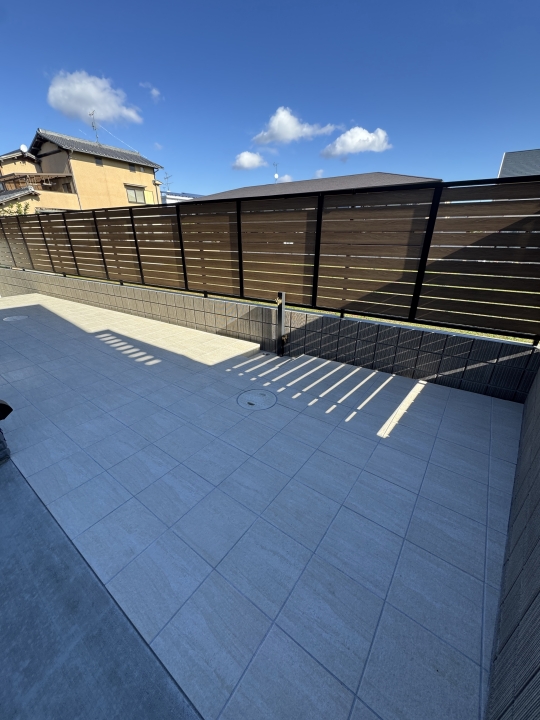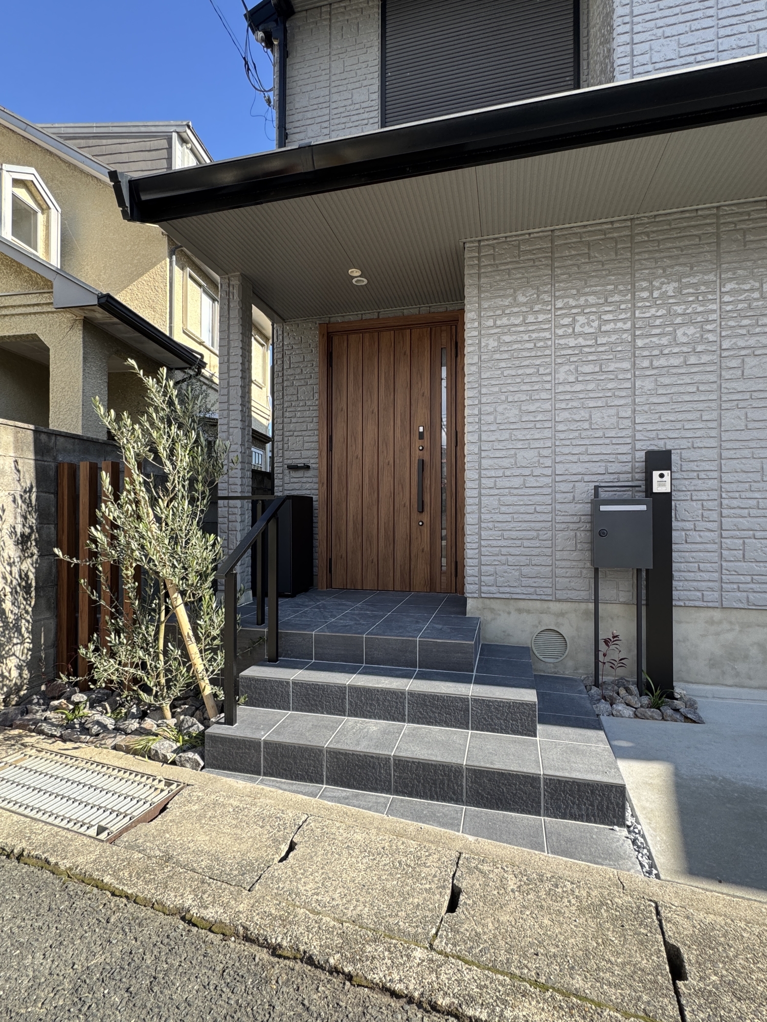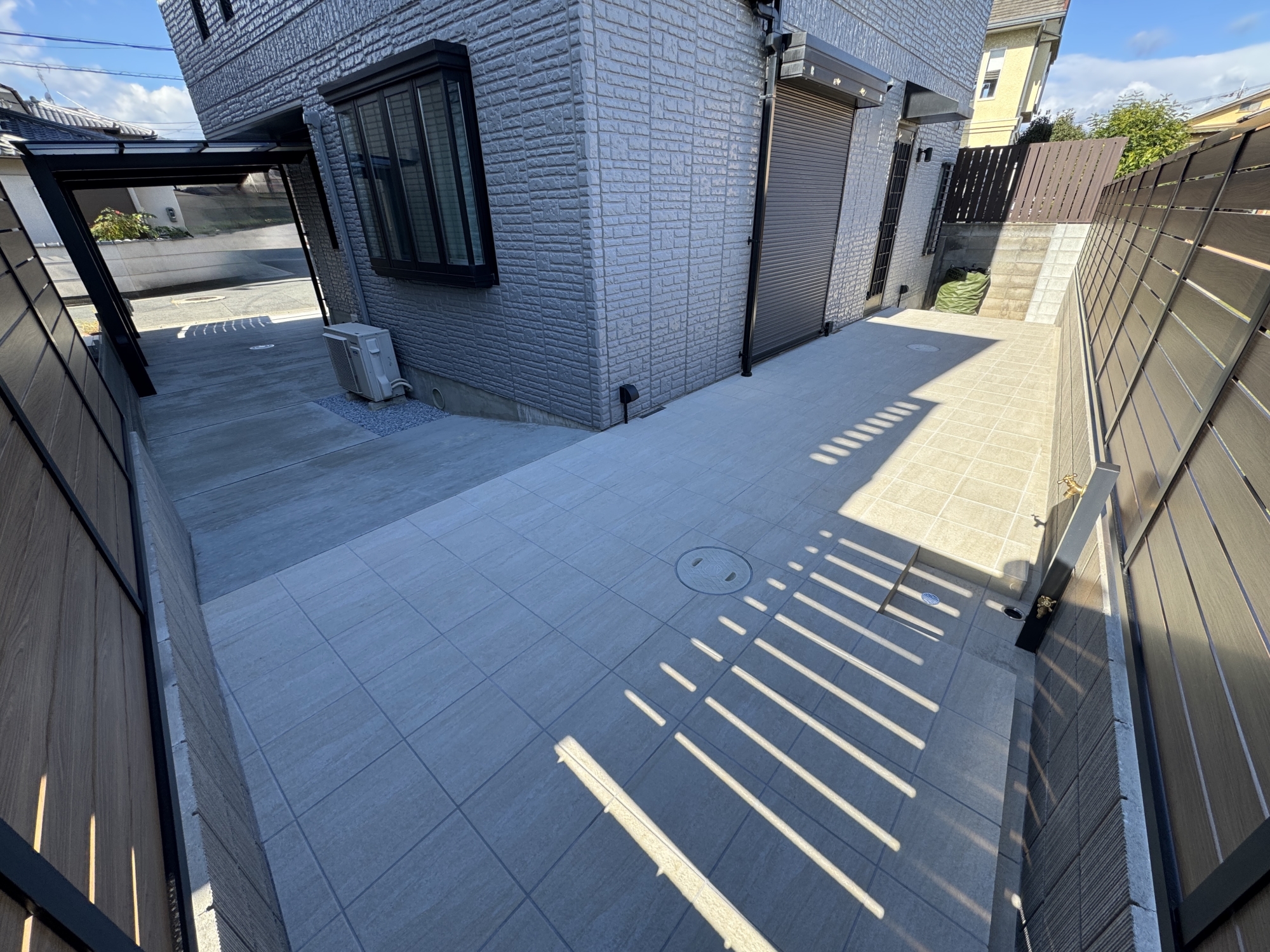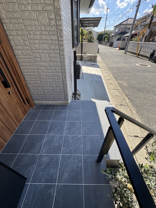 HOME エクステリア施工事例 西京区Y様邸 リフォーム外構工事 リフォーム完工前 リフォーム完工後 建物廻り完工前 建物廻り完工後(タイルテラス) ・完工写真・アプローチ(タイル階段)・シンボルツリー(オリーブ) 完工写真 アプローチ(タイル階段) シンボルツリー(オリーブ) ・駐車スペース(土間コンクリート刷毛引き)・LIXILカーポート(ネスカF) 駐車スペース(土間コンクリート刷毛引き) LIXILカーポート(ネスカF) 土間コンクリート刷毛引き タイルテラス タイルテラス